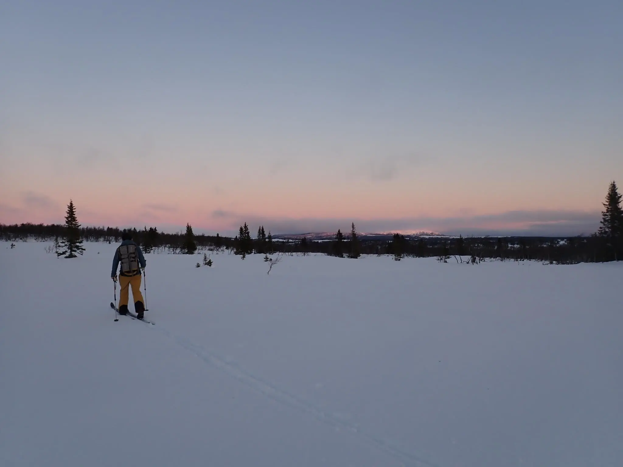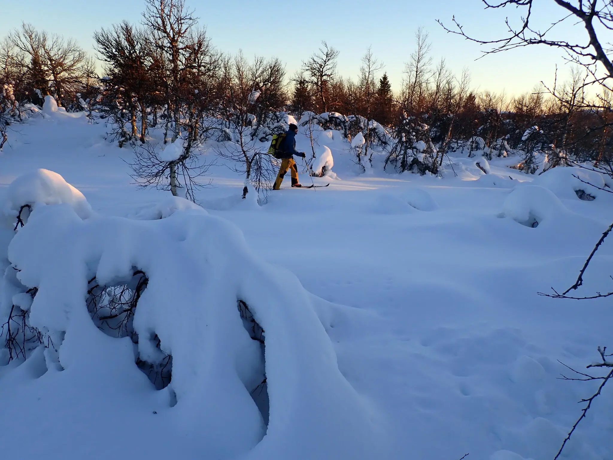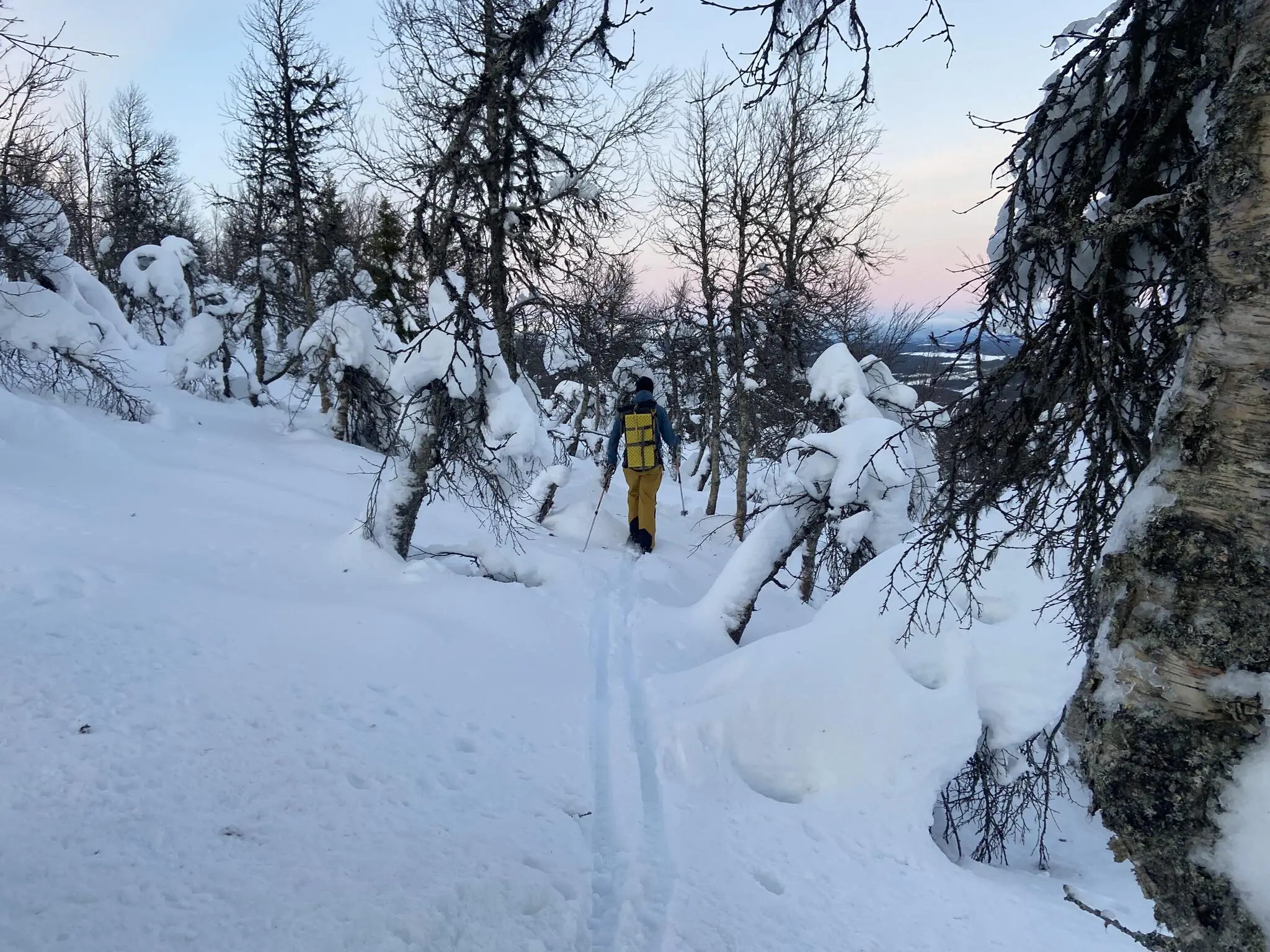 Efter smalbodrun fortdätte vi längs ryggen av småfjäll till den skogsklädda Gammalbodrun. Det blev en fika i sista solljuset där. Upp på toppen och sedan skida tillbaka mot bilen, genom ett långt skrå i björkskogen. Mot slutet över myrar fyllde med skoterspår.