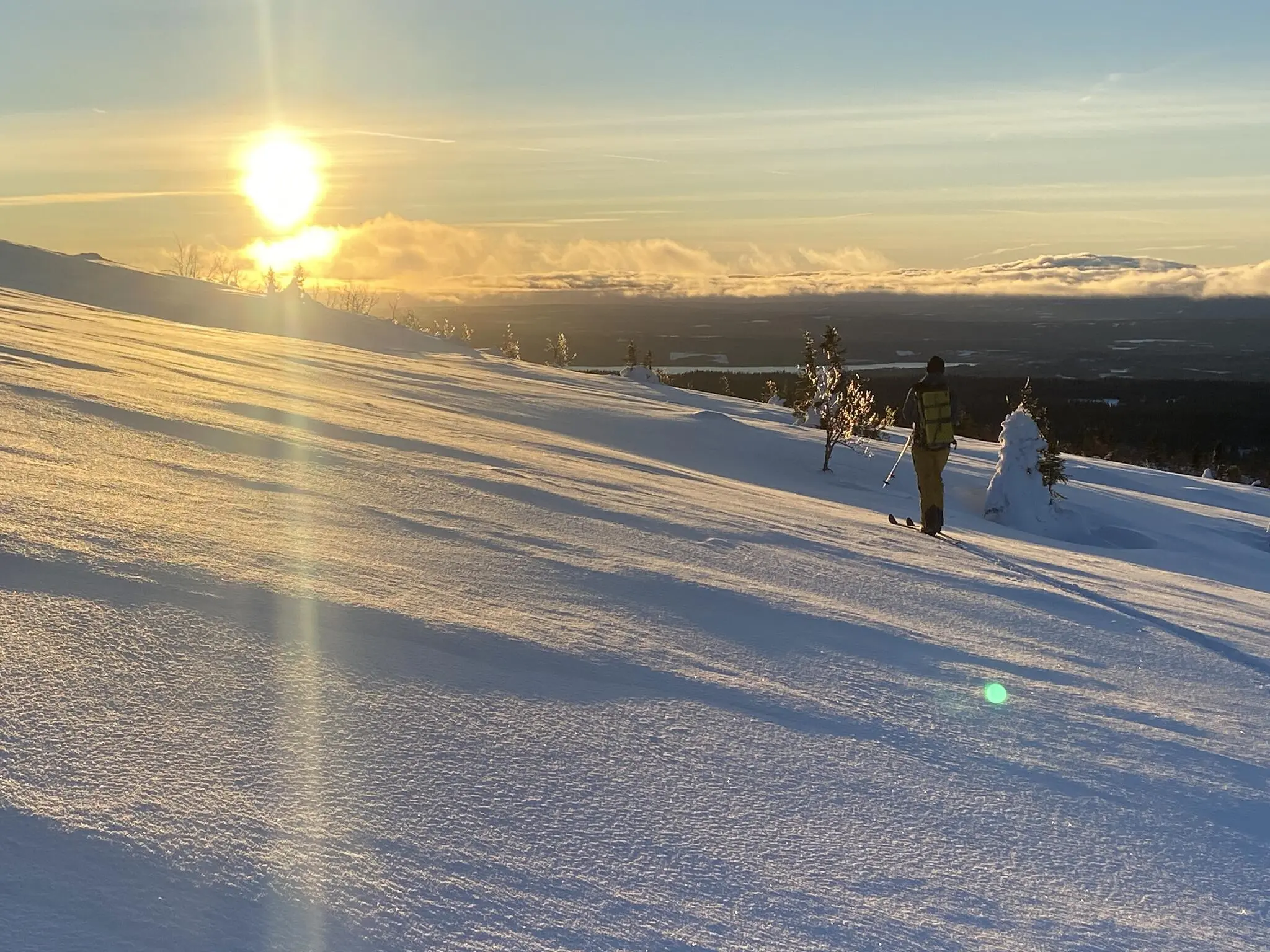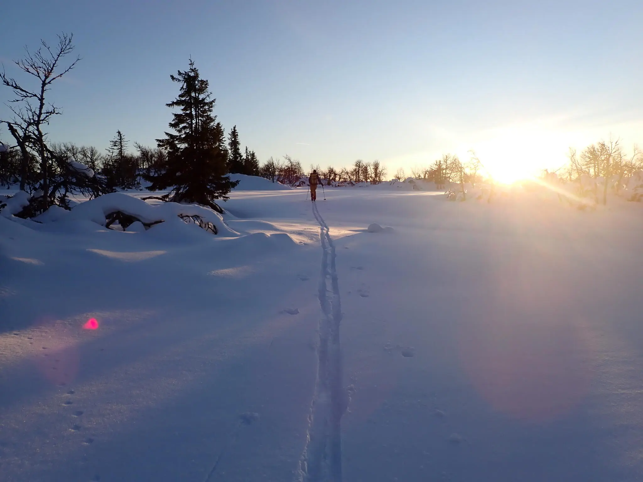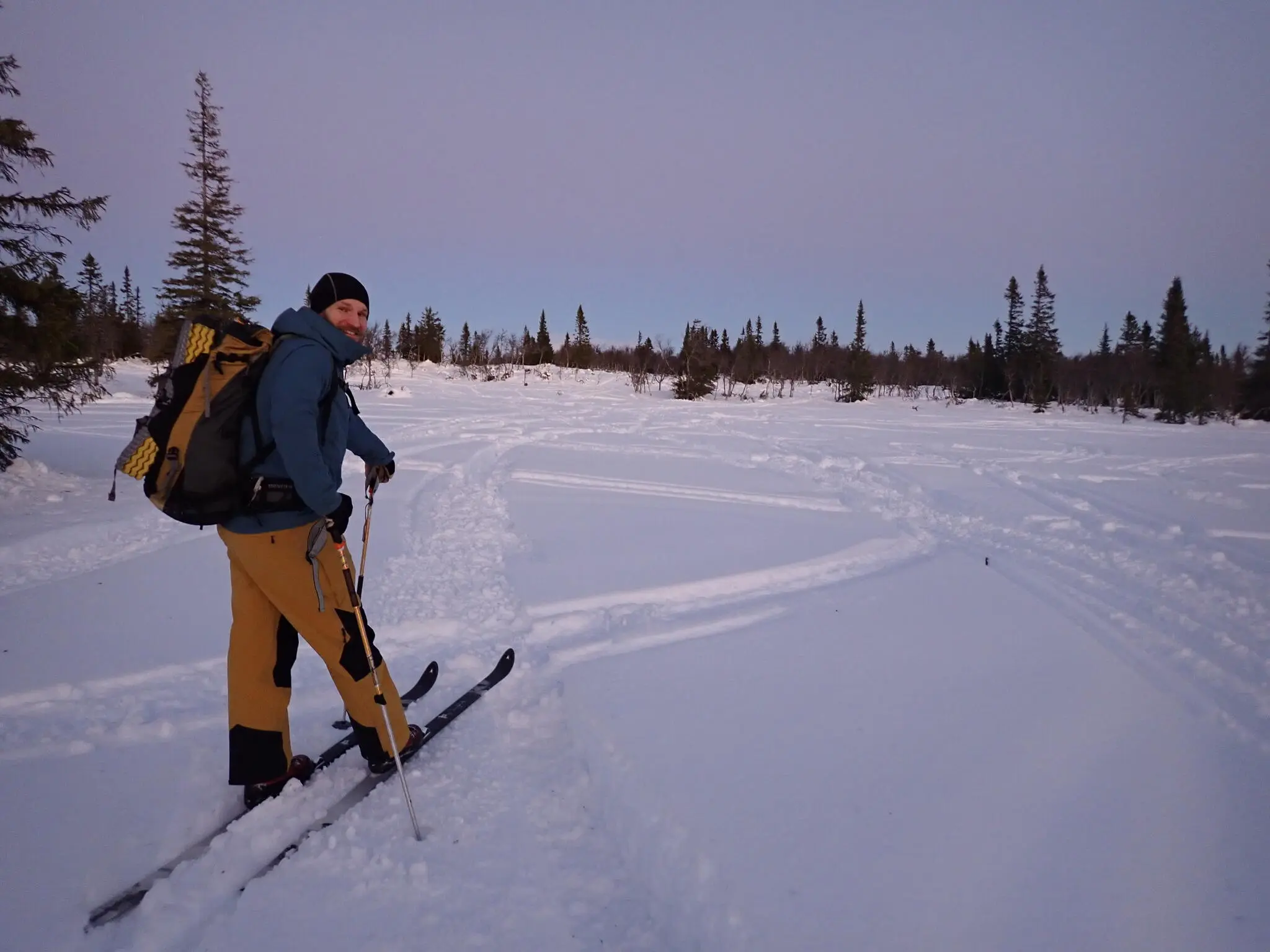 Efter smalbodrun fortdätte vi längs ryggen av småfjäll till den skogsklädda Gammalbodrun. Det blev en fika i sista solljuset där. Upp på toppen och sedan skida tillbaka mot bilen, genom ett långt skrå i björkskogen. Mot slutet över myrar fyllde med skoterspår.
