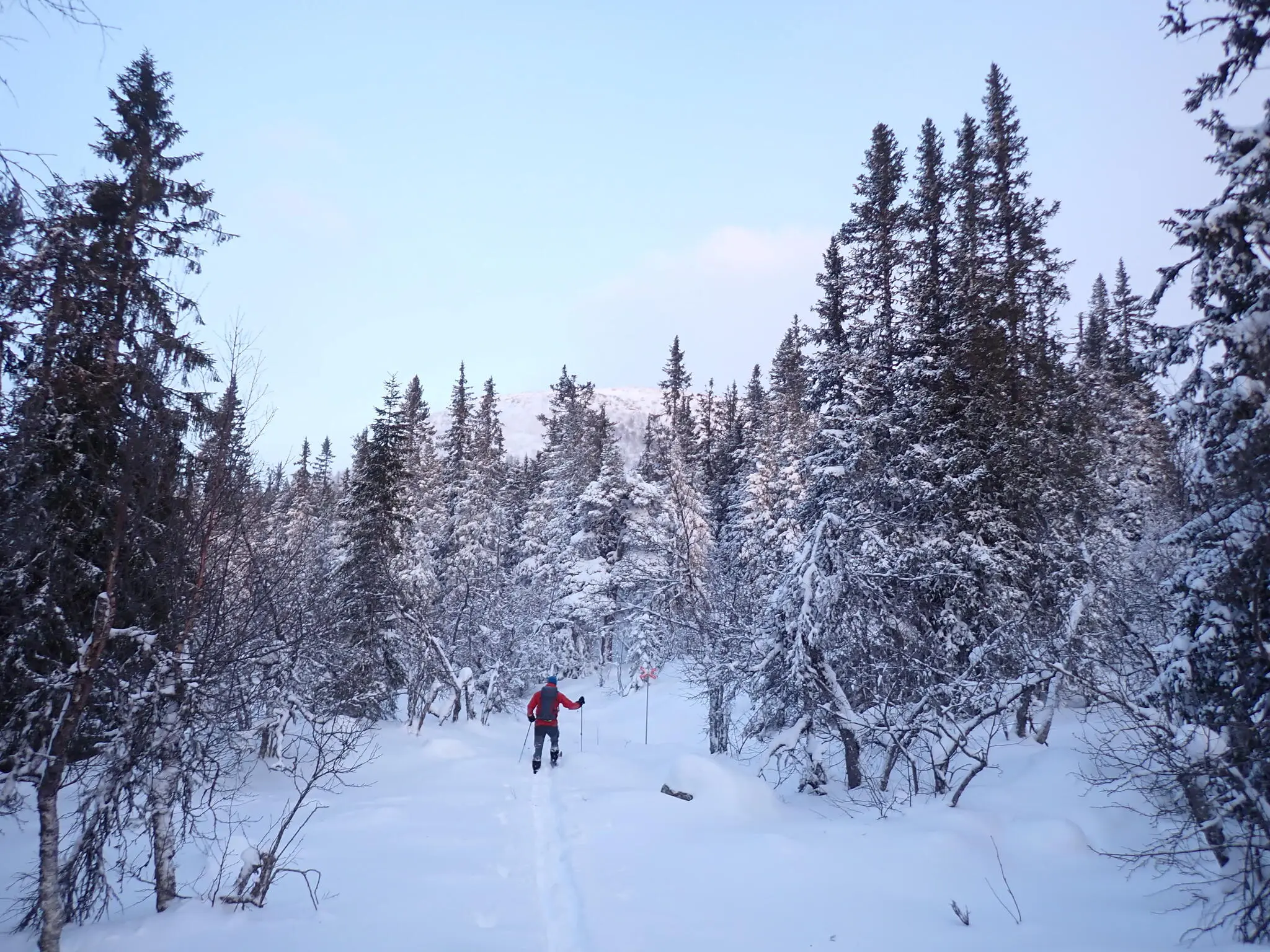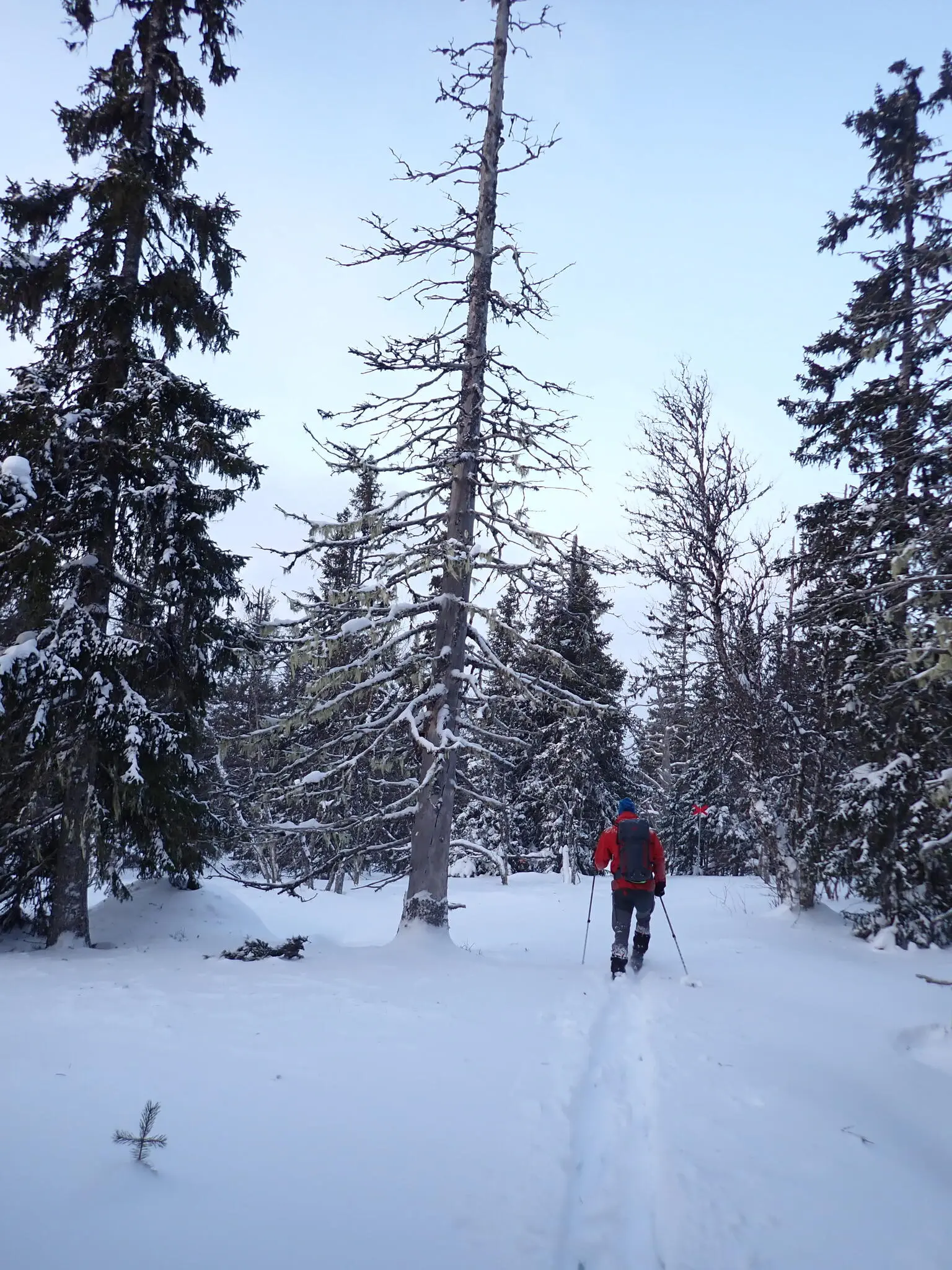Vi skidade medsolsvarv, så vi började med skogsdelen. Jag skidade runt fjället för 8-9 år sedan och då fanns spår från andra skidåkare. Denna gång spårade vi, så det tog längre tid än planerat. Effektiv skidtid tog det ungefär 4 timmar.