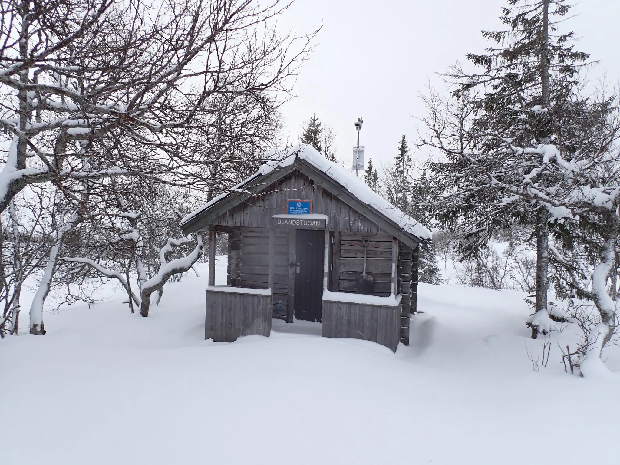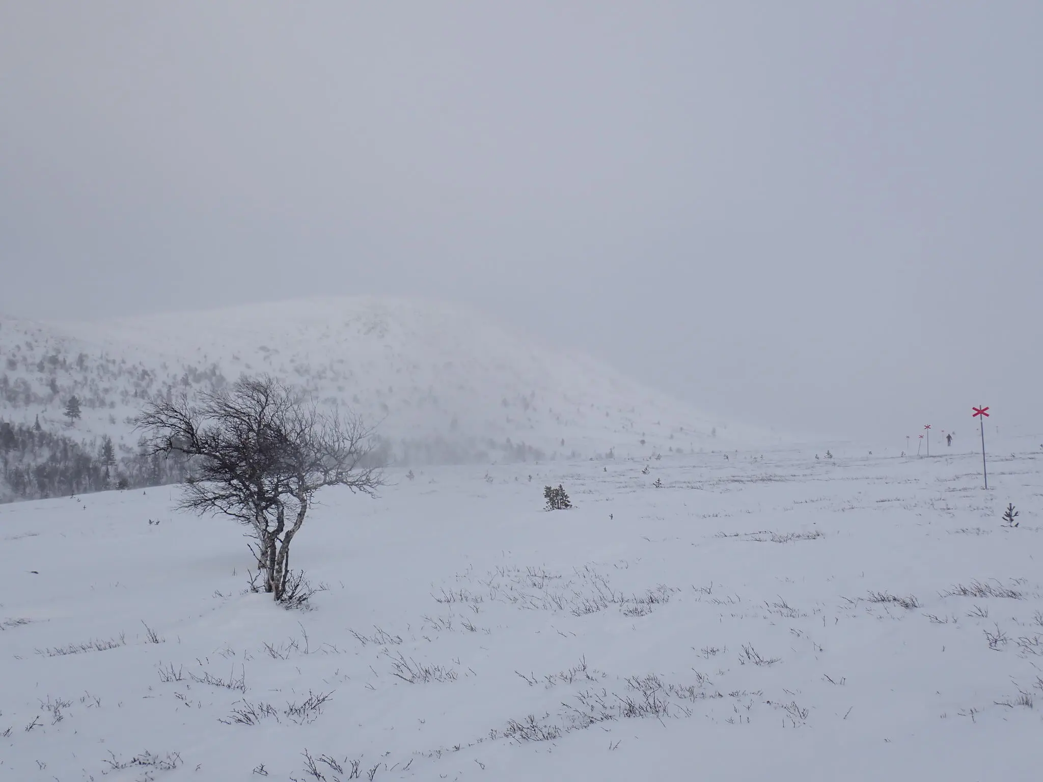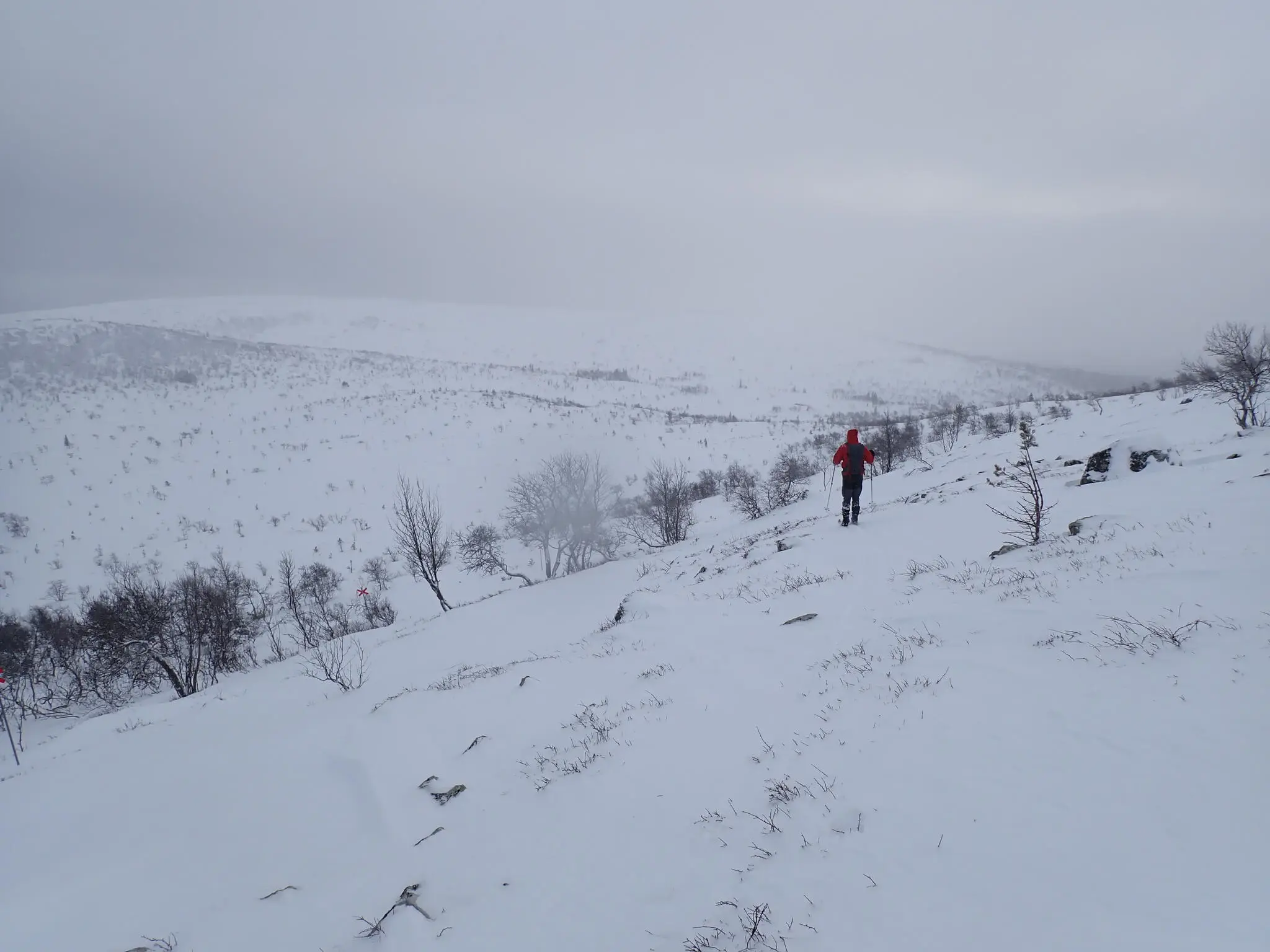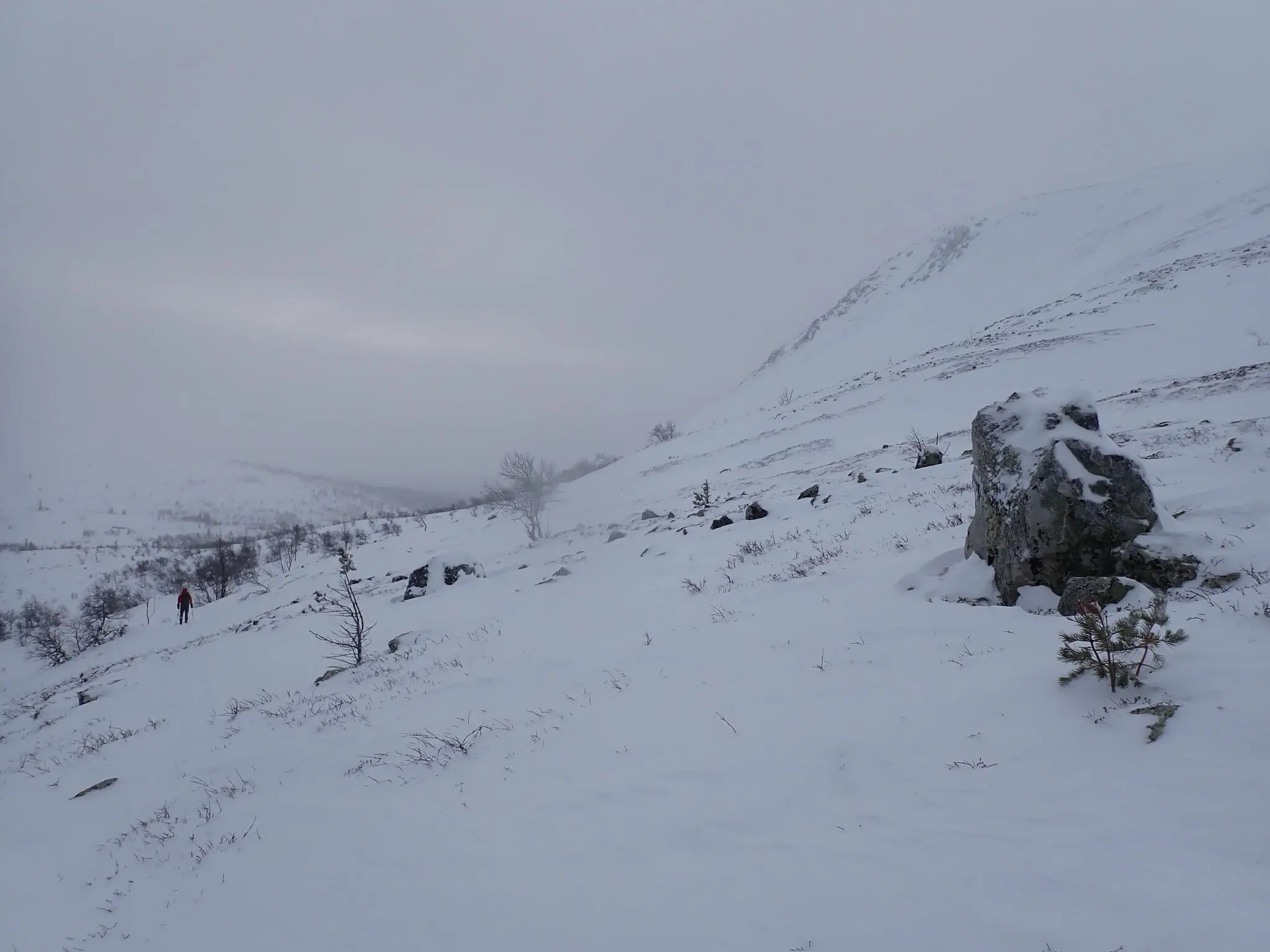 Väl uppe på kalfjället genade vi förbi Slagebäckkojan. Vi siktade på Ulandsstugan istället, för lunch. Men först skulle vi ta oss dit. Uppför flacka dalen mellan Slagebäckstöten och Nipfjället i lätt motvind och rätt dålig sikt.