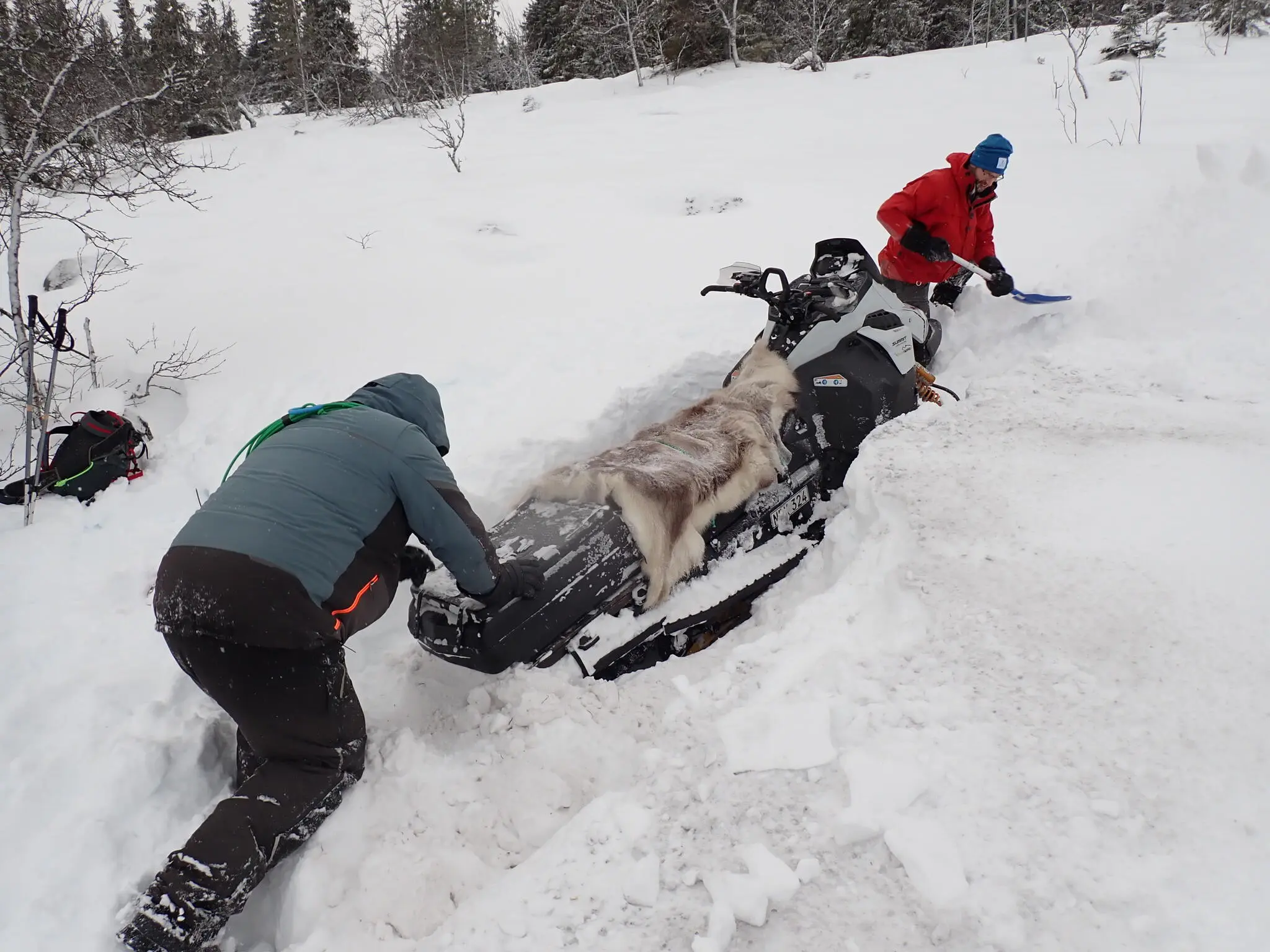 När vi precis lämnat stugan kom en renägare förbi på skoter. Vi småpratade lite. En km längre fram i en brant uppförsbacke körde han fast i djupsnön. Vi försökte hjälpa till så gott vi kunde. Han kom loss till slut.