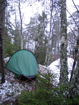 - I skogen, testar min nyinköpta (från Prylmarknaden här på Utsidan) bivybag. Lite klaustrofobiskt ...