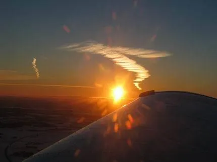 Solnedgång sedd från ett sportflygplan en februarikväll när termometern visade -15 grader.