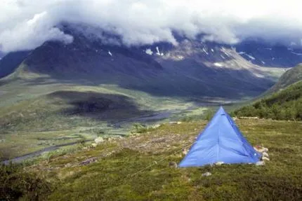 Underbar tältplats! Och fint foto dessutom, mycket dramatiskt med molnen som rullar nedför fjällsidan.