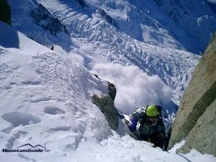 Fin vinterbestigning och helt ensamma på den kanske finsate (garanterat populäraste) turen i Chamonix. Mitt under klättringen kom en enorm lavin ner från Mt Blanc du Tacul och välde fram över glaciären under oss.