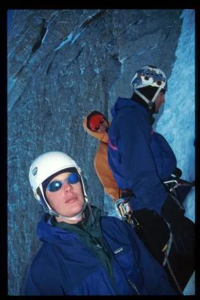 Klättrare Jonas Jidlund, Ulf Nilsson, Anders Lagerström. Stand efter två replängder på en av lederna på tacyl du mt blanc.