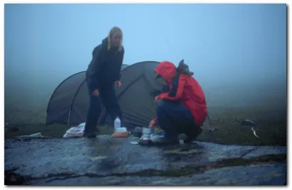 Eftersom vattnet i jocken var så högt tänkte vi vänta till nästa morgon med att vada över.Under natten drog ett regnväder över fjället och när vi vaknade på morgonen kunde man högts se tio meter framför sig.