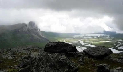Utsikt över Rapa-deltat från Nammatj topp, en regning sen Augusti dag.
