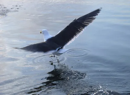 Fiskmåsens första vingslag efter att ha lämnat vattnet. Skapade en perfekt droppformation i vattnet under varje vinge.<br><br>