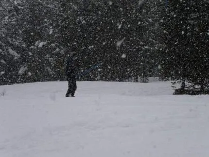 Den 8 april 2005 snöade det oavbrutet över ett helt dygn. Det kom 3 dm snö. Bilden är tagen mot släpliften i Lofsdalen i Härjedalen. Den här dagen blev det bara 2 åk. Studerar man närmare så kan man urskilja personen som håller om släpliften.