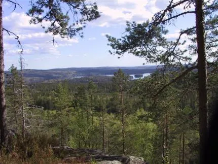 En försommarbild tagen från Tvärstup, med utsikt mot St Ulvsjön. Tvärstup är ett sydväxtberg SV om Borlänge. Här hittar man bl.a hassel och lind. På våren växer vit- och blåsippor i stora sjok nedanför berget. Underbart vackert!