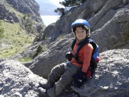 Alex kämpar tappert pâ bland sylvassa klippor och meterhögt Carritx-gräs. Pappa hade tänkt ut en smart genväg frân Coll de Sòller tillbaka till La Muleta.. men efter att ha kämpat sig genom oländig terräng blev det tvärstopp vid en ravin.. bara att vända.
