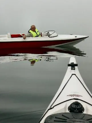 Roede fra Kongsmark strand mod storebæltsbroen, og mødte en motorbåd, fik en hyggelig snak med manden 1,5 km fra kysten.