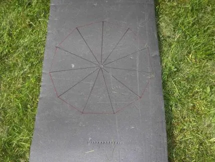 Liggunderlaget används för att hitta rätt positioner för tältspiken, en tältspik sätts i centrum på figuren, ett snöre med en nyckelring i var ände