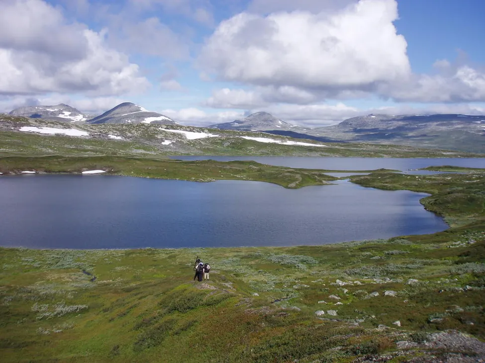 Reohitjärnen och toppar från vänster är mittiklumpen, Goegkemesspielte, Blåfjällhatten och blå fjället...