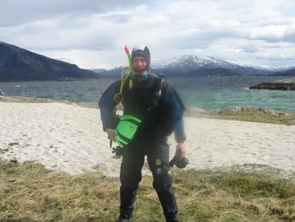 Dykning, utbildning i Norge. Sikten var ca 5-8m. Temp. 7grader. 12kg bly. Stora krabbor, musslor, småfisk och div växter. Simmade längsmed ett stup ca 18m ner. Fett på kameralinsen?