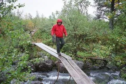 Jag gillar den här bilden. Den röda jackan bryter av fint mot naturen. Spången är rätt högt upp så att det känns lite äventyrligt att passera.