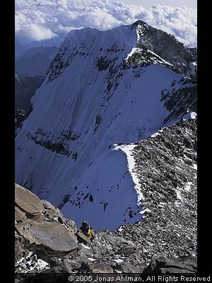 Per närmar sig toppen av Aconcagua med sydvägen i bakgrunden.