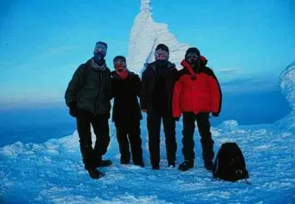 Första gången vi ser solen efter mörketid. Temp. -37 C, vind 2-3m/s. Nästan molnfritt, vi kunde se hur långt som helst. Solskivan kikade över horisonten i fem minuter. Mekaniken i min kamera frös. Foto Niels Festenberg (den långe killen).