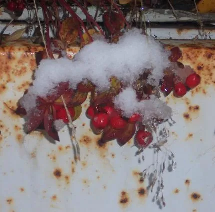 Lingon hängandes över ett rostigt kylskåp efter årets första snöfall.