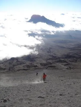 På väg ner från toppen av Kilimanjaro joggande genom lavagruset med Mawenzi som utsikt.