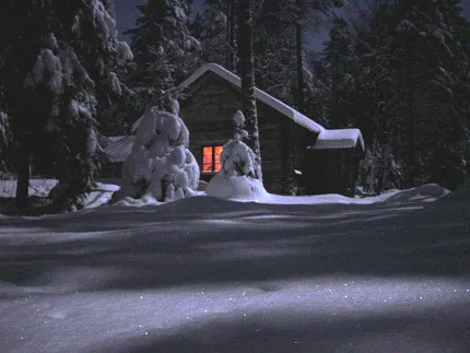 Härlig vinterbild.Vilken varmt sken i fönstret.Passande julkortsmotiv.