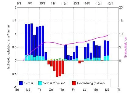 Beräknad istillväxt/avsmältning för en 5 cm tjock kärnis, snöfri eller med 2 cm torr snö och väderinformation (data från NOAA/ARL , www.arl.noaa.gov/ready/cmet.html). Beräkningen bygger på väderprognosdata för Bromma flygplats. Förklaring: staplar - istillväxt/avsmältning mm/timme (vänstra skalan); stolpar - nederbörd mm/timme (vänstra skalan, vit: snö, gul: blötsnö/regnblandat, grön: regn); lila kurva –snöfri nyistjocklek cm (högra skalan).
