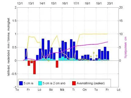 Beräknad istillväxt/avsmältning för en 5 cm tjock kärnis, snöfri eller med 2 cm torr snö och väderinformation (data från NOAA/ARL , www.arl.noaa.gov/ready/cmet.html). Beräkningen bygger på väderprognosdata för Bromma flygplats. Förklaring: staplar - istillväxt/avsmältning mm/timme (vänstra skalan); stolpar - nederbörd mm/timme (vänstra skalan, vit: snö, gul: blötsnö/regnblandat, grön: regn); lila kurva –snöfri nyistjocklek cm (högra skalan); gul kurva – molnighet (vänstra skalan 0 – 1).