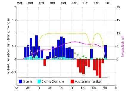 Beräknad istillväxt/avsmältning för en 5 cm tjock kärnis, snöfri eller med 2 cm torr snö och väderinformation (data från NOAA/ARL , www.arl.noaa.gov/ready/cmet.html). Beräkningen bygger på väderprognosdata för Bromma flygplats. Förklaring: staplar - istillväxt/avsmältning mm/timme (vänstra skalan); stolpar - nederbörd mm/timme (vänstra skalan, vit: snö, gul: blötsnö/regnblandat, grön: regn); lila kurva –snöfri nyistjocklek cm (högra skalan); gul kurva – molnighet (vänstra skalan 0 – 1).