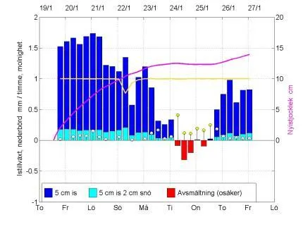 Beräknad istillväxt/avsmältning för en 5 cm tjock kärnis, snöfri eller med 2 cm torr snö och väderinformation (data från NOAA/ARL , www.arl.noaa.gov/ready/cmet.html). Beräkningen bygger på väderprognosdata för Bromma flygplats. Förklaring: staplar - istillväxt/avsmältning mm/timme (vänstra skalan); stolpar - nederbörd mm/timme (vänstra skalan, vit: snö, gul: blötsnö/regnblandat, grön: regn); lila kurva –snöfri nyistjocklek cm (högra skalan); gul kurva – molnighet (vänstra skalan 0 – 1).