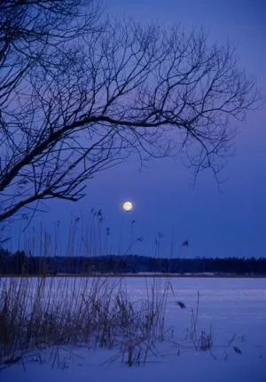 Månen på väg ned över Valletnunasjön(där långfärdssridksotävlingen Krogrännet går) tidigt en morgon i februari, månen ser ut att vila på ett vasstrå.