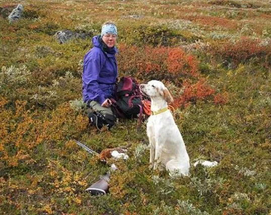 Våran hund Wanna med sin första ripa i ett riktigt fågeljobb. Skönt att de funkar efter all tid man tränat henne