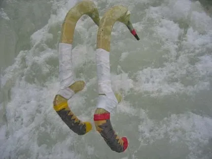 Yxor gjorda av en träkärna där ett blad har bultats fast för att senare glasfiberarmeras.