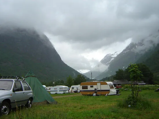 +18* C på Campingen, +3* C och 11 m is på toppen. (www.strynefjellet.com)