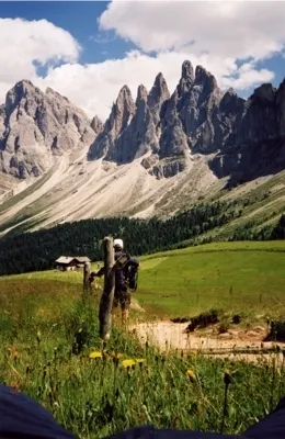 Stigen är en del av led 35 i Val Gardena. I bakgrunden yns Geisler Odles.