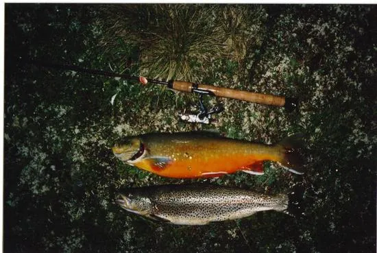 Fick öringen först. Några minuter sedan smällde det till igen och efter ett tags drillning såg jag den stora röda buken på rödingen. Var i chocktillstånd. Öringen var på 49 cm och rödingen på 52 cm. Togs i en liten fjälltjärn som bara var ett par meter djup.