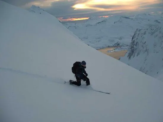 Telemark i pudersnö i solnedgången med 1000m ned till parkeringen och havet.