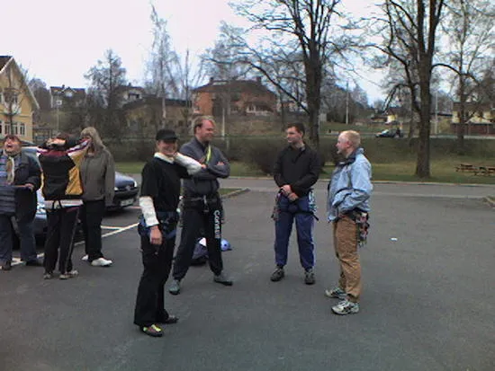 Här diskuterar vi klättringen och har just blivgit informerade om var tabergs berguvar häckar så att vi inte skall störa dem under vår klätting mot toppen!