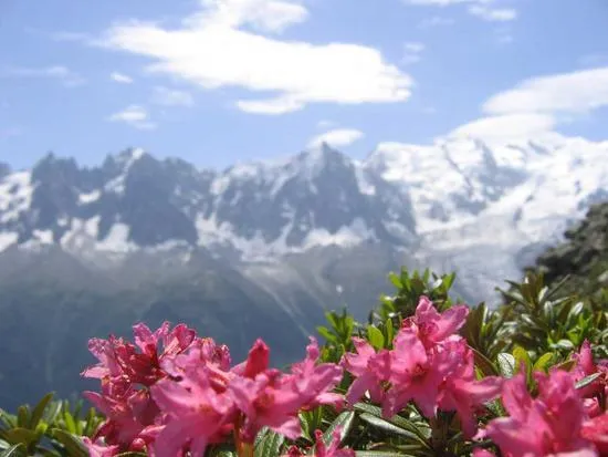 Mont Blanc med dess aguiller och de typiska färgranna blommorna im förgrunden som finns på alla hyllor i klippväggen.
