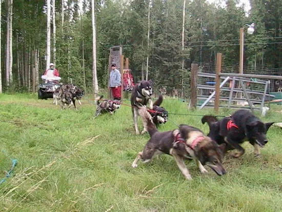 Vi tränar hundarna tidigt på morgonen innan värmen kommer och myggen vaknar. Hundarna tränas med en 4-hjuling som de drar längre och längre varje dag för att få bra kondition inför vinterns tävlingarna.Foto: Bill McKee
