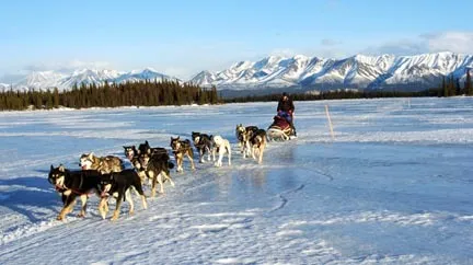 Sandy, en 57-årig kvinna, kör hundspannet i Iditarodtävlingen. Foto: Bill McKee