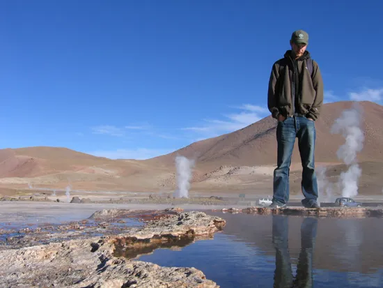 Grodperspektiv på min lillebror när vi i tidig morgon besöker geisrar i Atacamaöknen.