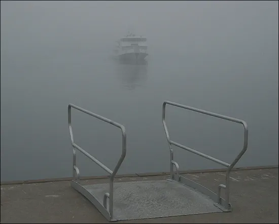 Styrsöbolagets båt m/s Skarven träder fram ur "tjockan" och kaptenen kör långsamt mot bryggan.