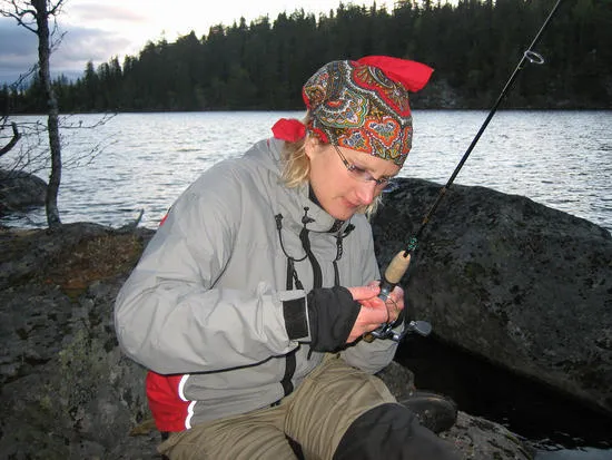 Jenni fick blodad tand efter att ha dragit upp en fin kilosöring på 4:e kastet. Det här är lite senare, det trasslar och är kallt om fingrarna.