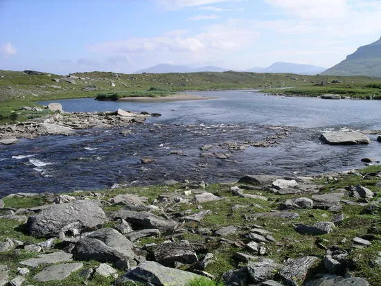 Vadställe i närheten av den plats där bron fanns tidigare, väster om Stibokjavrre