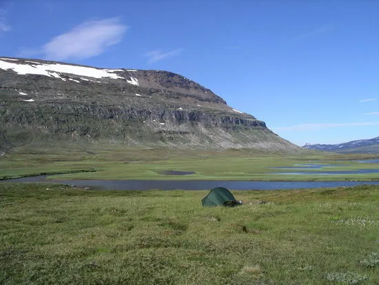 Fin tältplats vid Sieberjåhkå 1 km öster om Stibokjavrre. Det grottrika fjället Stibok i bakgrunden.