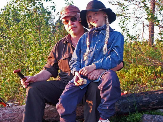 Jag och dottern Maja vid brasan inför nattens tältning. Vi var på en paddeltur med några kompisar under semestern.