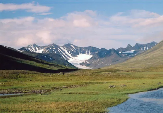 Vy från Alkavagge mot centrala Sarek. Glaciären Mikkajekna i mitten.