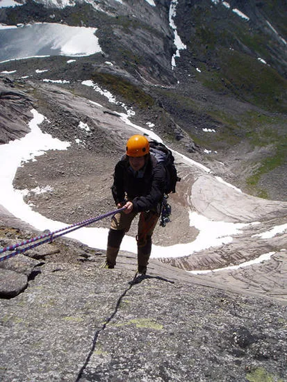 Oscar firar sig ner från mysosten på norges nationalfjäll stetind. Han tyckte det var ganska luftigt.