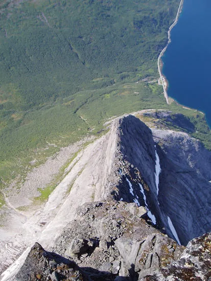 Ligger på toppen av stetind och ser ner mot parkeringen. 1391 møh